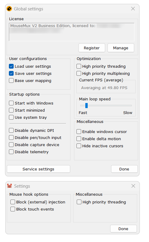 Pressing the Settings button will open the configuration for MouseMux. Here you can change the global settings of MouseMux.
