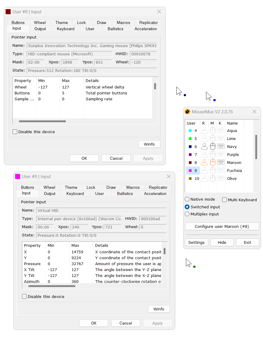 while in fact MouseMux is fully controlling it. Note that currently only mouse interaction is emulated (and not pen or touch).