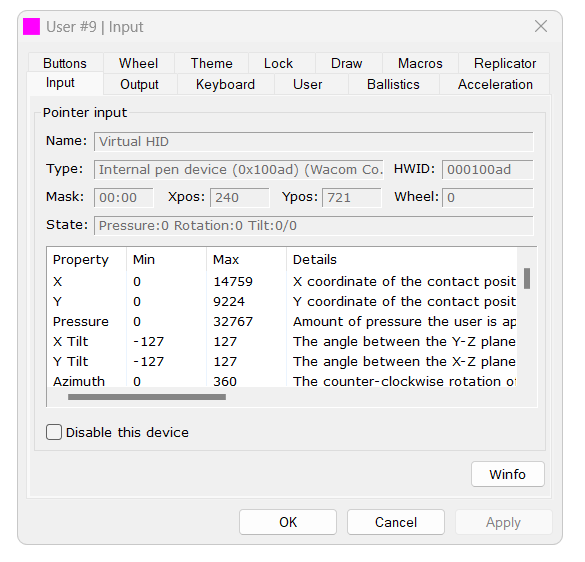 and make sure the Disable this device checkbox is not enabled both in the input tab and in the keyboard tab.